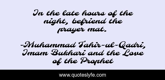 This page presents the quote "In the late hours of the night, befriend the prayer mat.". Author of this quote is Muhammad Tahir-ul-Qadri, Imam Bukhari and the Love of the Prophet. This quote is about spirituality, islam,.