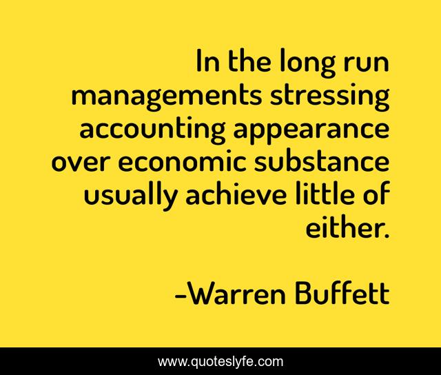 This page presents the quote "In the long run managements stressing accounting appearance over economic substance usually achieve little of either.". Author of this quote is Warren Buffett. This quote is about accounting, economic, principals, business,.