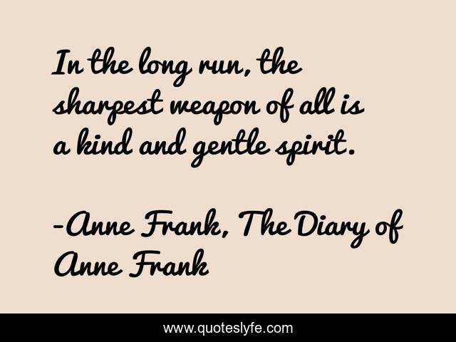 This page presents the quote "In the long run, the sharpest weapon of all is a kind and gentle spirit.". Author of this quote is Anne Frank, The Diary of Anne Frank. This quote is about enthusiasm, inspirational,.