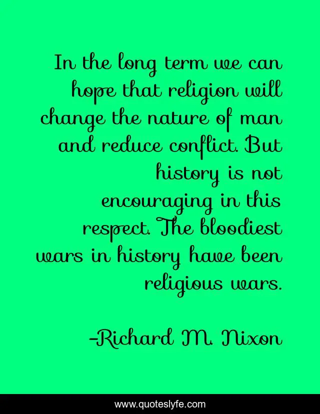 This page presents the quote "In the long term we can hope that religion will change the nature of man and reduce conflict. But history is not encouraging in this respect. The bloodiest wars in history have been religious wars.". Author of this quote is Richard M. Nixon. This quote is about respect, change, nature,.