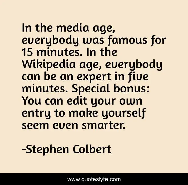 This page presents the quote "In the media age, everybody was famous for 15 minutes. In the Wikipedia age, everybody can be an expert in five minutes. Special bonus: You can edit your own entry to make yourself seem even smarter.". Author of this quote is Stephen Colbert. This quote is about media, age, yourself,.