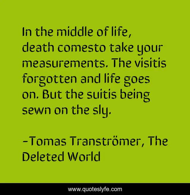 This page presents the quote "In the middle of life, death comesto take your measurements. The visitis forgotten and life goes on. But the suitis being sewn on the sly.". Author of this quote is Tomas Tranströmer, The Deleted World. This quote is about death, poetry,.