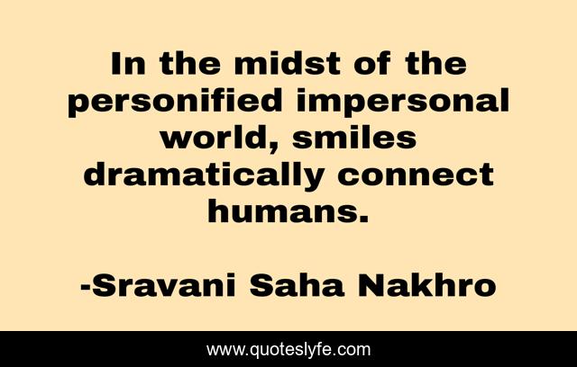 This page presents the quote "In the midst of the personified impersonal world, smiles dramatically connect humans.". Author of this quote is Sravani Saha Nakhro. .