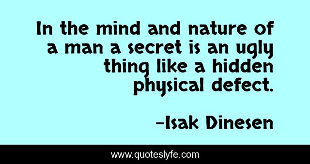 This page presents the quote "In the mind and nature of a man a secret is an ugly thing like a hidden physical defect.". Author of this quote is Isak Dinesen. This quote is about secrets, secrecy,.