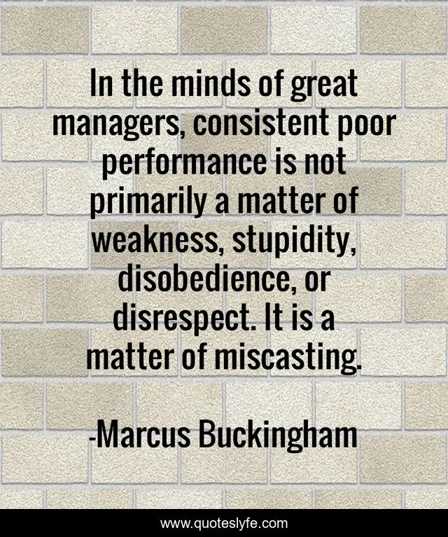 This page presents the quote "In the minds of great managers, consistent poor performance is not primarily a matter of weakness, stupidity, disobedience, or disrespect. It is a matter of miscasting.". Author of this quote is Marcus Buckingham. .