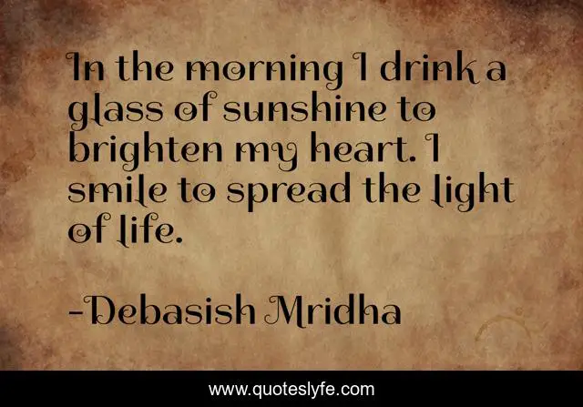 This page presents the quote "In the morning I drink a glass of sunshine to brighten my heart. I smile to spread the light of life.". Author of this quote is Debasish Mridha. This quote is about debasish, mridha, philosophy, inspirational, enthusiasm, smile, sunshine, happiness,.