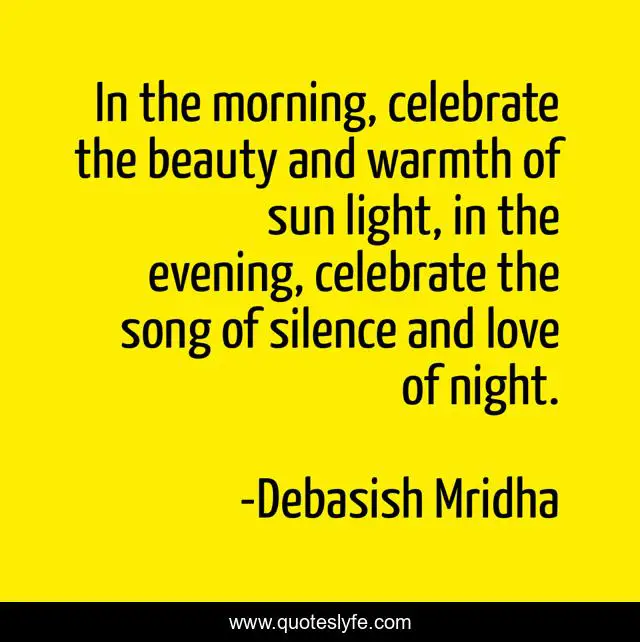 This page presents the quote "In the morning, celebrate the beauty and warmth of sun light, in the evening, celebrate the song of silence and love of night.". Author of this quote is Debasish Mridha. This quote is about love, intelligence, education, happiness, knowledge, sun, enthusiasm, warmth, hope,.