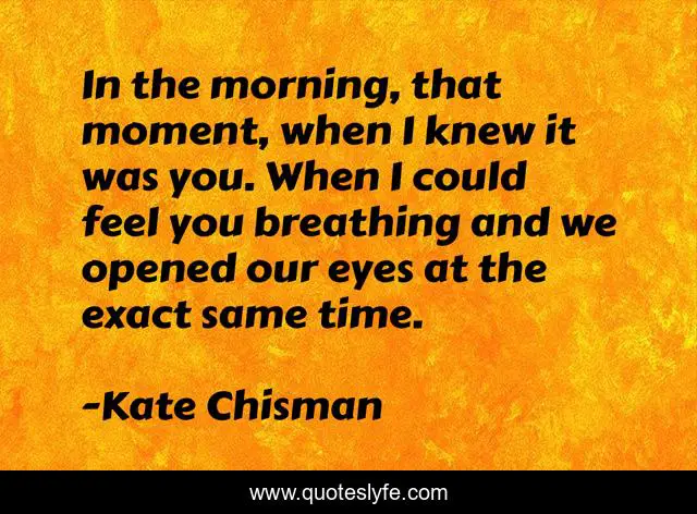 This page presents the quote "In the morning, that moment, when I knew it was you. When I could feel you breathing and we opened our eyes at the exact same time.". Author of this quote is Kate Chisman. This quote is about relationships, affairs, lovers, love, relationship, first-love, romance, lust, adieu,.