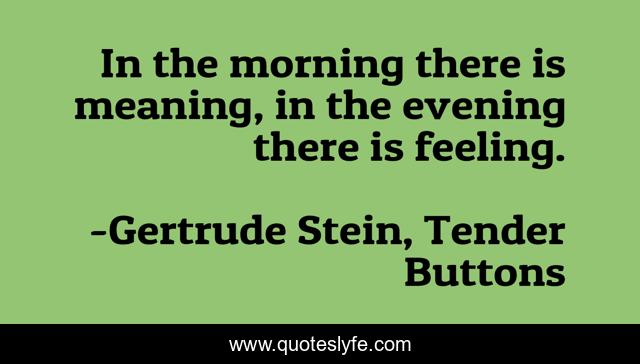 This page presents the quote "In the morning there is meaning, in the evening there is feeling.". Author of this quote is Gertrude Stein, Tender Buttons. .