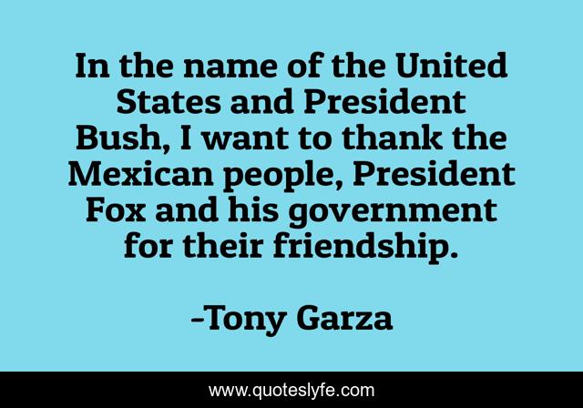 This page presents the quote "In the name of the United States and President Bush, I want to thank the Mexican people, President Fox and his government for their friendship.". Author of this quote is Tony Garza. This quote is about government, name, people,.