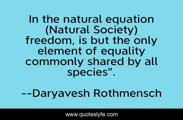This page presents the quote "In the natural equation (Natural Society) freedom, is but the only element of equality commonly shared by all species".". Author of this quote is -Daryavesh Rothmensch. This quote is about darius-radmanesh, daryavesh-rothmensch, natural-society, nature,.