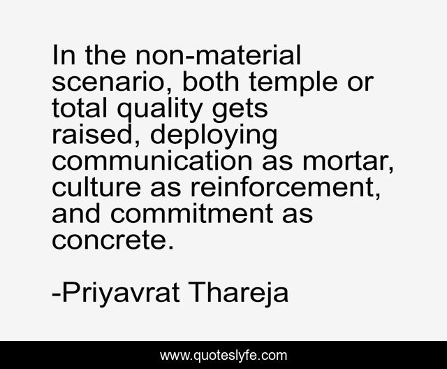 This page presents the quote "In the non-material scenario, both temple or total quality gets raised, deploying communication as mortar, culture as reinforcement, and commitment as concrete.". Author of this quote is Priyavrat Thareja. This quote is about holy, communication, commitment, culture, temple, total-quality,.