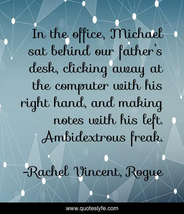 This page presents the quote "In the office, Michael sat behind our father’s desk, clicking away at the computer with his right hand, and making notes with his left. Ambidextrous freak.". Author of this quote is Rachel Vincent, Rogue. This quote is about funny, comedy,.
