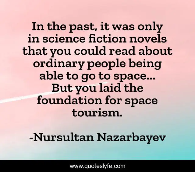 This page presents the quote "In the past, it was only in science fiction novels that you could read about ordinary people being able to go to space... But you laid the foundation for space tourism.". Author of this quote is Nursultan Nazarbayev. This quote is about past, science, people,.