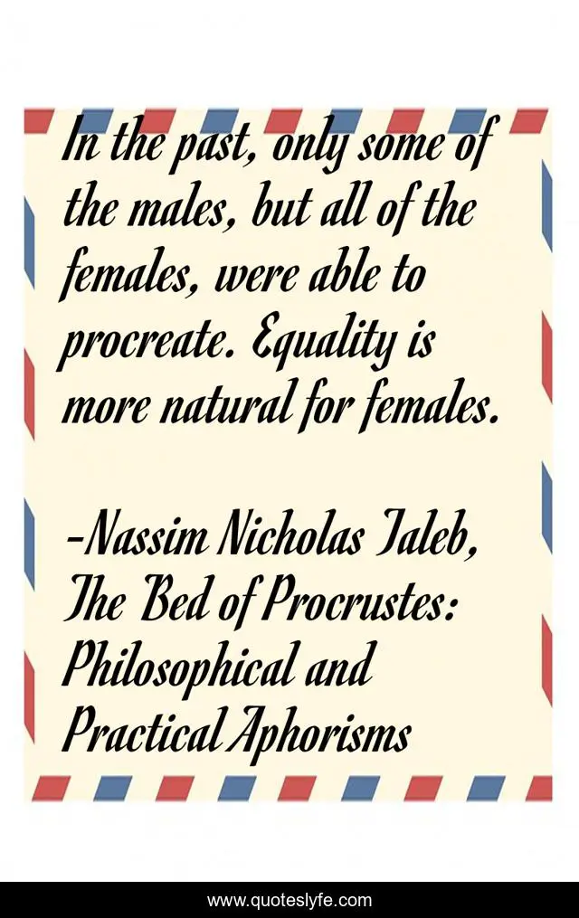 This page presents the quote "In the past, only some of the males, but all of the females, were able to procreate. Equality is more natural for females.". Author of this quote is Nassim Nicholas Taleb, The Bed of Procrustes: Philosophical and Practical Aphorisms. This quote is about equality, past, femininity, equity, feminism, history,.