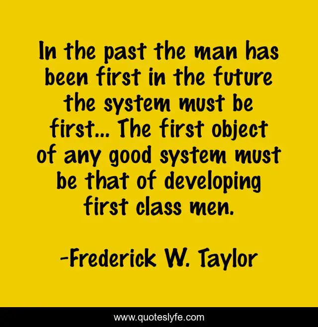 This page presents the quote "In the past the man has been first in the future the system must be first... The first object of any good system must be that of developing first class men.". Author of this quote is Frederick W. Taylor. This quote is about past, future, man,.