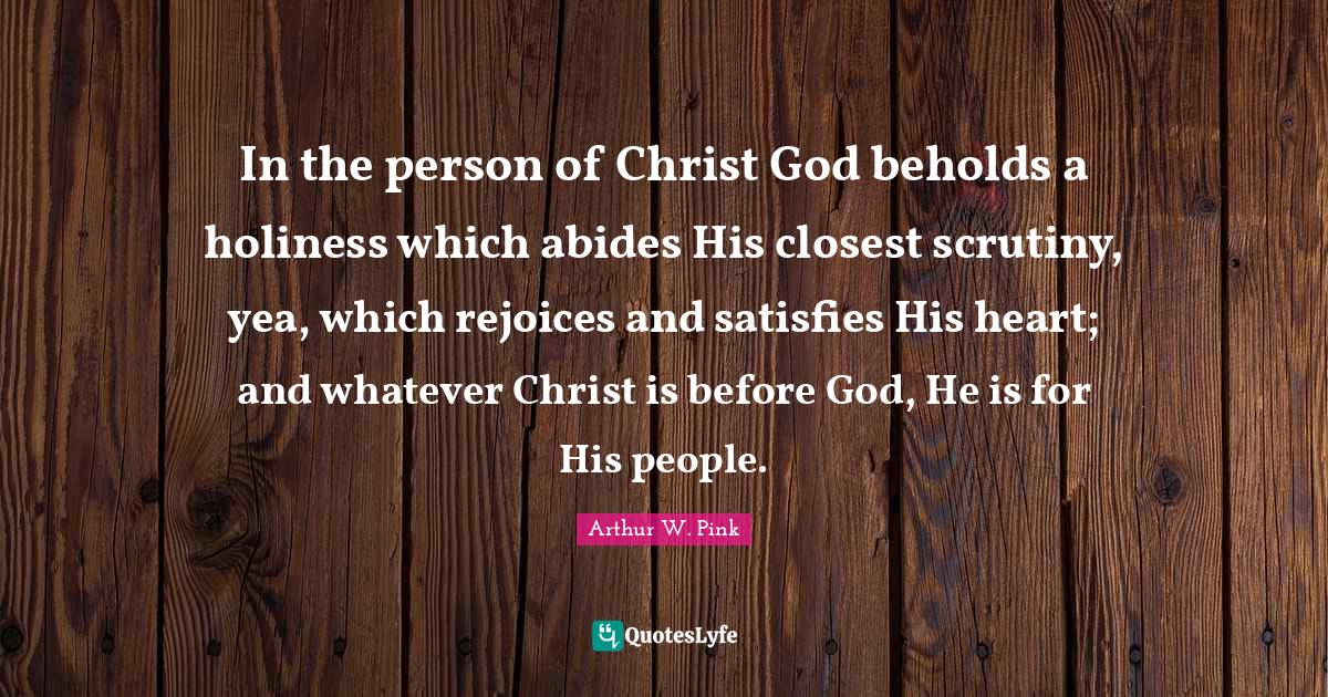 This page presents the quote "In the person of Christ God beholds a holiness which abides His closest scrutiny, yea, which rejoices and satisfies His heart; and whatever Christ is before God, He is for His people.". Author of this quote is Arthur W. Pink. This quote is about scrutiny, holiness, people, god, closest, christ, heart,.
