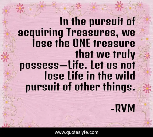 This page presents the quote "In the pursuit of acquiring Treasures, we lose the ONE treasure that we truly possess—Life. Let us not lose Life in the wild pursuit of other things.". Author of this quote is RVM. This quote is about inspirationa, motivation,.