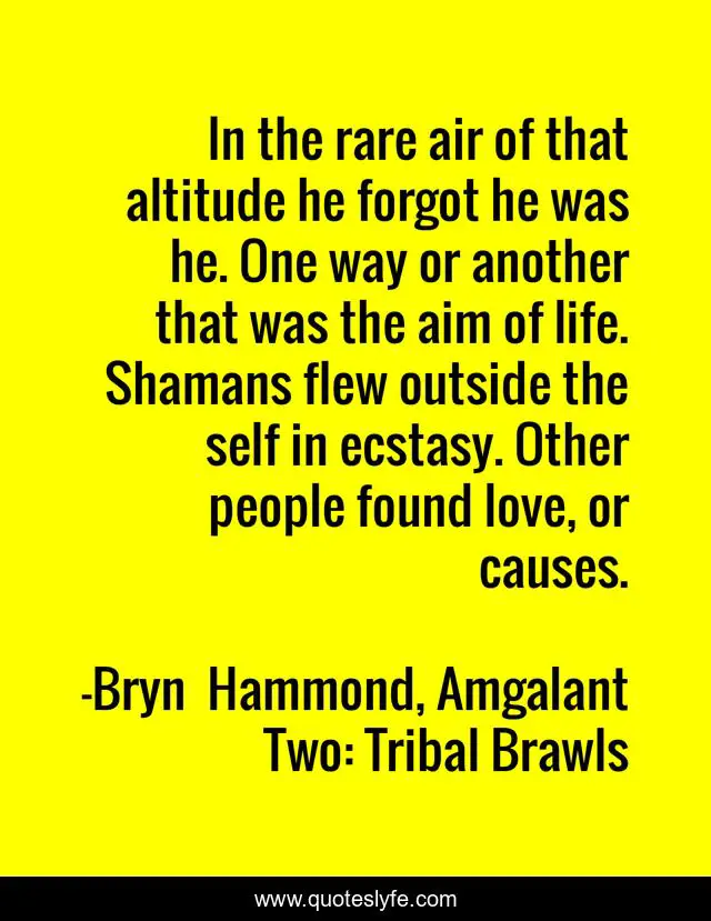 This page presents the quote "In the rare air of that altitude he forgot he was he. One way or another that was the aim of life. Shamans flew outside the self in ecstasy. Other people found love, or causes.". Author of this quote is Bryn Hammond, Amgalant Two: Tribal Brawls. This quote is about transcendence, self,.