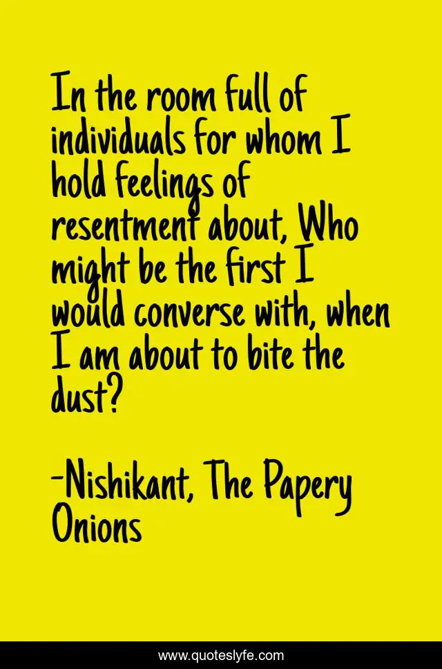 This page presents the quote "In the room full of individuals for whom I hold feelings of resentment about, Who might be the first I would converse with, when I am about to bite the dust?". Author of this quote is Nishikant, The Papery Onions. This quote is about the-papery-onions, life, death, love, thepaperyonions, grudges, death-and-dying, affection,.