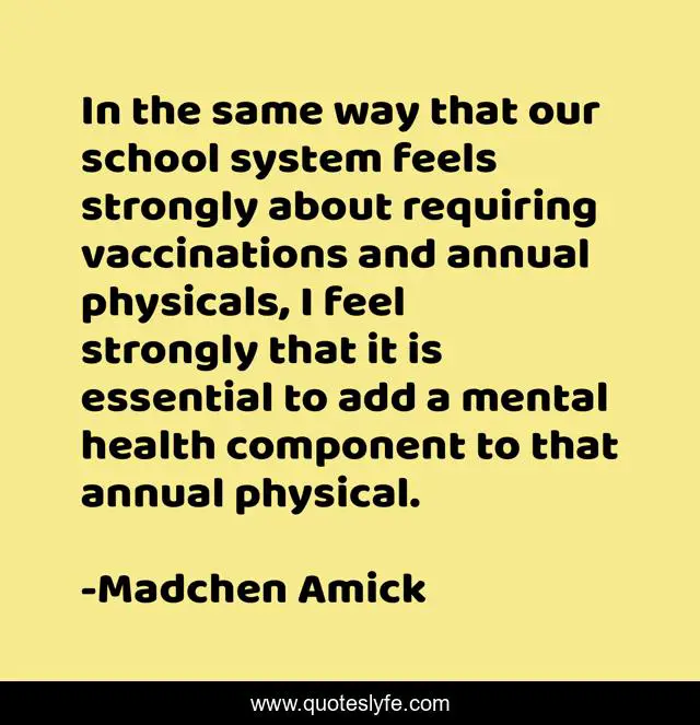 This page presents the quote "In the same way that our school system feels strongly about requiring vaccinations and annual physicals, I feel strongly that it is essential to add a mental health component to that annual physical.". Author of this quote is Madchen Amick. This quote is about school, mental health, way,.