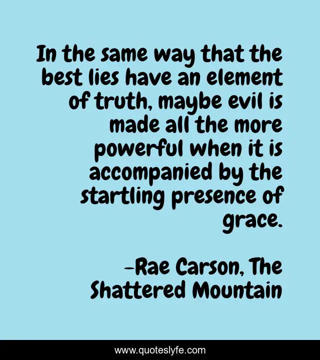 This page presents the quote "In the same way that the best lies have an element of truth, maybe evil is made all the more powerful when it is accompanied by the startling presence of grace.". Author of this quote is Rae Carson, The Shattered Mountain. .