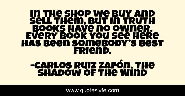 This page presents the quote "In the shop we buy and sell them, but in truth books have no owner. Every book you see here has been somebody’s best friend.". Author of this quote is Carlos Ruiz Zafón, The Shadow of the Wind. .