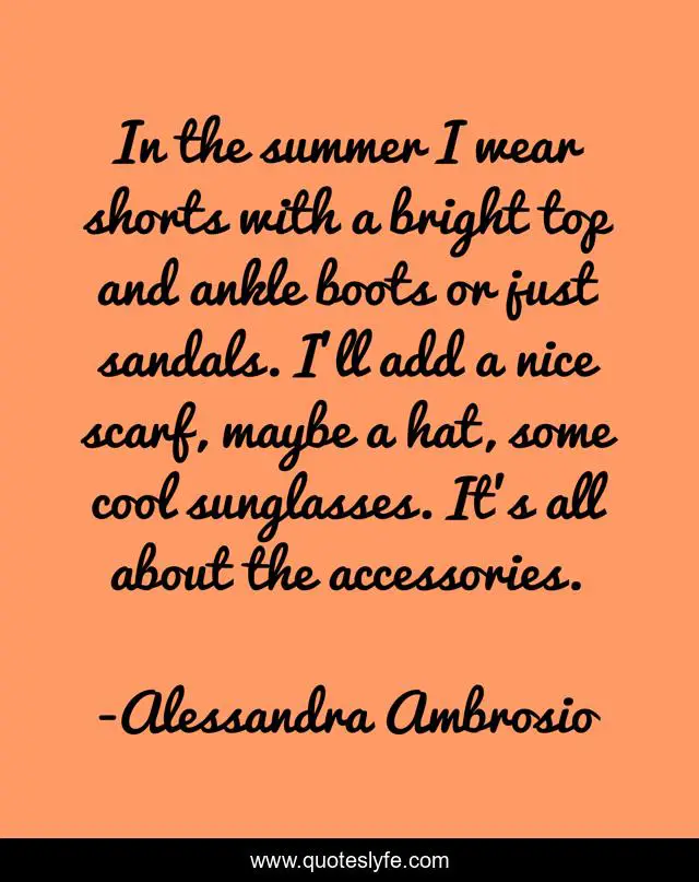 This page presents the quote "In the summer I wear shorts with a bright top and ankle boots or just sandals. I'll add a nice scarf, maybe a hat, some cool sunglasses. It's all about the accessories.". Author of this quote is Alessandra Ambrosio. This quote is about summer, sunglasses, nice,.