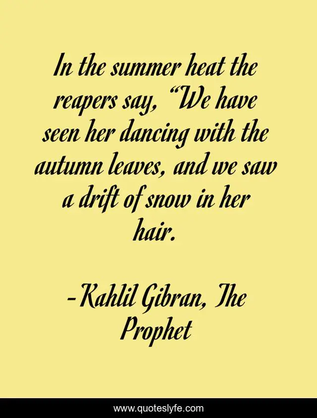 This page presents the quote "In the summer heat the reapers say, “We have seen her dancing with the autumn leaves, and we saw a drift of snow in her hair.". Author of this quote is Kahlil Gibran, The Prophet. This quote is about summer, winter, her, season, leaves, snow, autumn, seasons,.