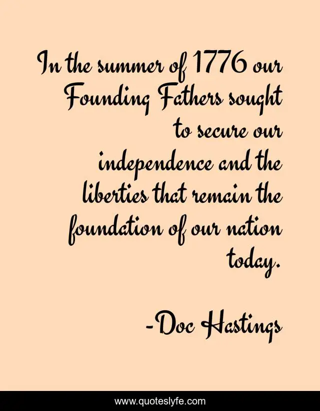 This page presents the quote "In the summer of 1776 our Founding Fathers sought to secure our independence and the liberties that remain the foundation of our nation today.". Author of this quote is Doc Hastings. This quote is about foundation, today, summer,.