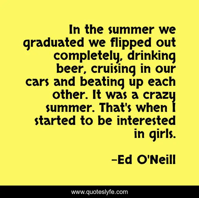 This page presents the quote "In the summer we graduated we flipped out completely, drinking beer, cruising in our cars and beating up each other. It was a crazy summer. That's when I started to be interested in girls.". Author of this quote is Ed O'Neill. This quote is about summer, crazy, beer,.