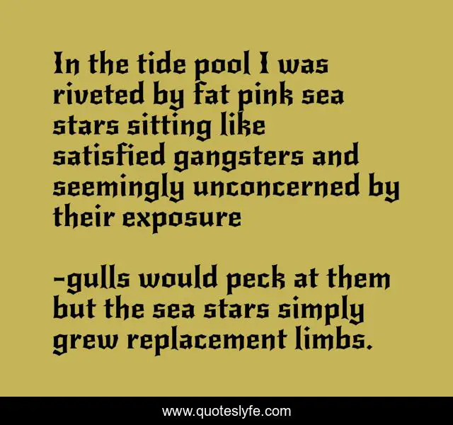 "gulls would peck at them but the sea stars simply grew replacement limbs. Quotes." Quoteslyfe.com, 2025. Sat. 06 Dec. 2025. <https://www.quoteslyfe.com/quote/In-the-tide-pool-I-was-riveted-72699>.