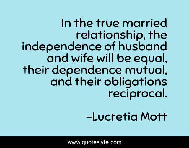 This page presents the quote "In the true married relationship, the independence of husband and wife will be equal, their dependence mutual, and their obligations reciprocal.". Author of this quote is Lucretia Mott. This quote is about equality, marriage,.