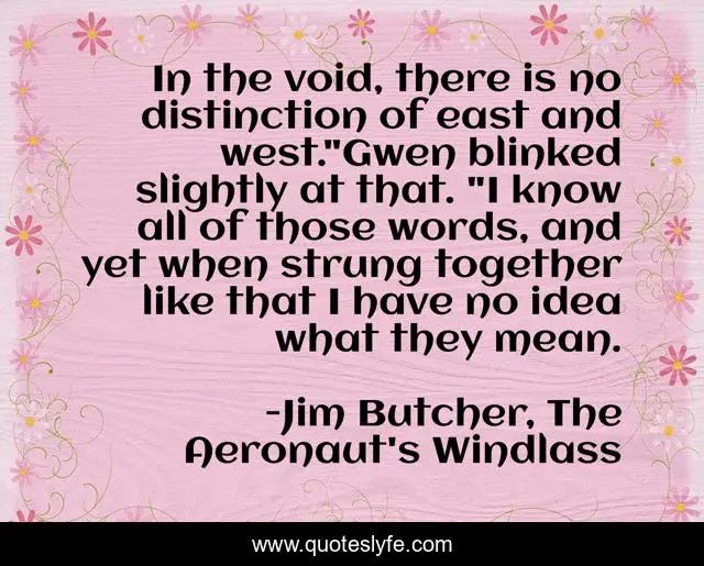 This page presents the quote "In the void, there is no distinction of east and west."Gwen blinked slightly at that. "I know all of those words, and yet when strung together like that I have no idea what they mean.". Author of this quote is Jim Butcher, The Aeronaut's Windlass. This quote is about funny, steampunk, monk, fantasy, proverb, comedy,.