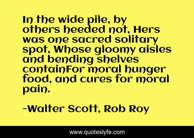 This page presents the quote "In the wide pile, by others heeded not, Hers was one sacred solitary spot, Whose gloomy aisles and bending shelves containFor moral hunger food, and cures for moral pain.". Author of this quote is Walter Scott, Rob Roy. This quote is about hideout, solitude, library,.