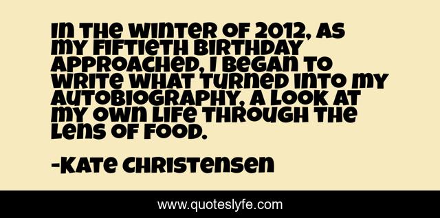 This page presents the quote "In the winter of 2012, as my fiftieth birthday approached, I began to write what turned into my autobiography, a look at my own life through the lens of food.". Author of this quote is Kate Christensen. This quote is about food, life, winter,.