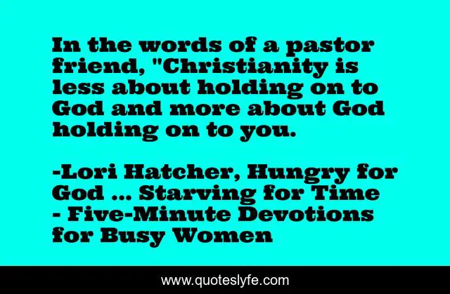 This page presents the quote "In the words of a pastor friend, "Christianity is less about holding on to God and more about God holding on to you.". Author of this quote is Lori Hatcher, Hungry for God ... Starving for Time - Five-Minute Devotions for Busy Women. This quote is about christian-living, devotional,.