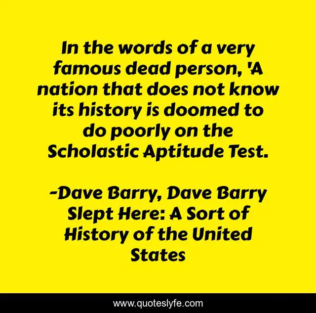 This page presents the quote "In the words of a very famous dead person, 'A nation that does not know its history is doomed to do poorly on the Scholastic Aptitude Test.". Author of this quote is Dave Barry, Dave Barry Slept Here: A Sort of History of the United States. This quote is about history, sat,.