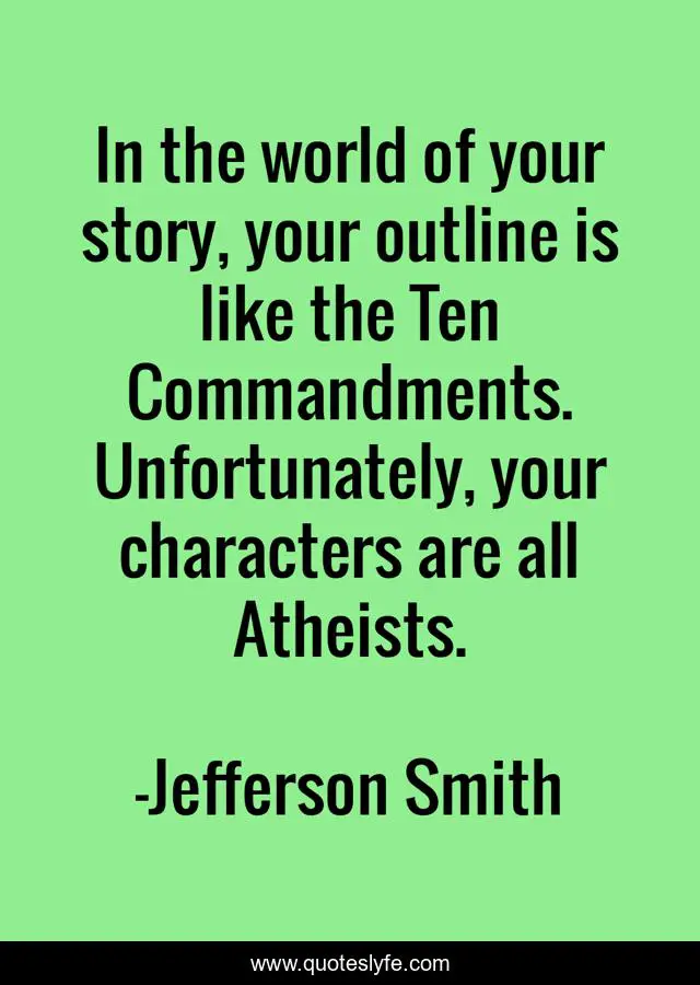 This page presents the quote "In the world of your story, your outline is like the Ten Commandments. Unfortunately, your characters are all Atheists.". Author of this quote is Jefferson Smith. This quote is about humor, outlines, characters, writing,.
