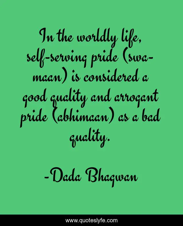 This page presents the quote "In the worldly life, self-serving pride (swa-maan) is considered a good quality and arrogant pride (abhimaan) as a bad quality.". Author of this quote is Dada Bhagwan. This quote is about spiritual, swamaan, arrogance, maan, self-pride, abhimaan, pride, arrogant, good-quality,.
