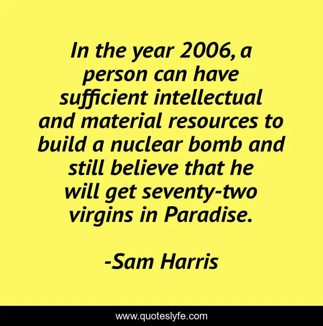 This page presents the quote "In the year 2006, a person can have sufficient intellectual and material resources to build a nuclear bomb and still believe that he will get seventy-two virgins in Paradise.". Author of this quote is Sam Harris. This quote is about god, morality, religion,.