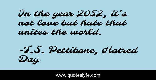 This page presents the quote "In the year 2052, it's not love but hate that unites the world.". Author of this quote is T.S. Pettibone, Hatred Day. This quote is about horror, young-adult-romance, science-fiction, fantasy, young-adult-science-fiction, young-adult-horror, young-adult, young-adult-fantasy,.