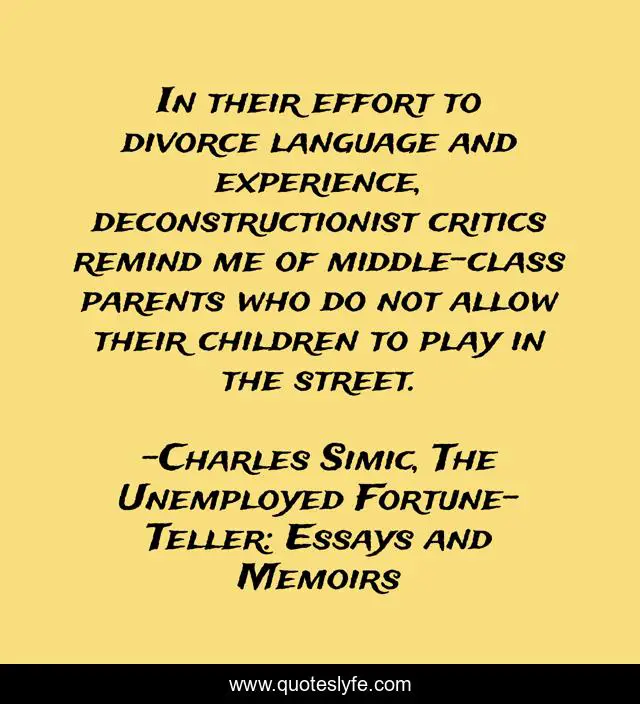 This page presents the quote "In their effort to divorce language and experience, deconstructionist critics remind me of middle-class parents who do not allow their children to play in the street.". Author of this quote is Charles Simic, The Unemployed Fortune-Teller: Essays and Memoirs. This quote is about criticism, deconstruction, poetry, language,.