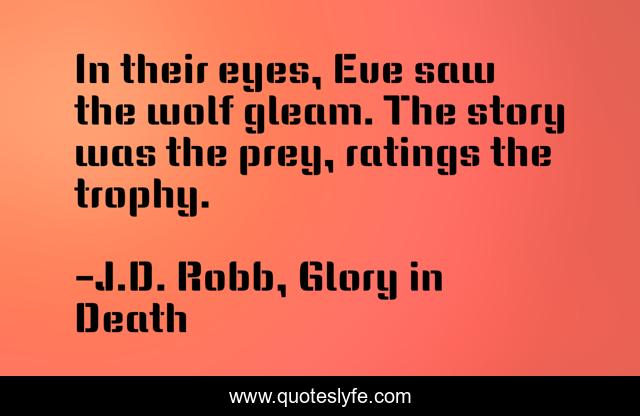 This page presents the quote "In their eyes, Eve saw the wolf gleam. The story was the prey, ratings the trophy.". Author of this quote is J.D. Robb, Glory in Death. This quote is about media, reporters,.