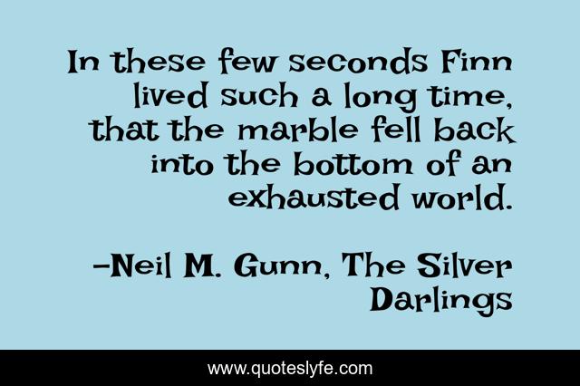This page presents the quote "In these few seconds Finn lived such a long time, that the marble fell back into the bottom of an exhausted world.". Author of this quote is Neil M. Gunn, The Silver Darlings. .