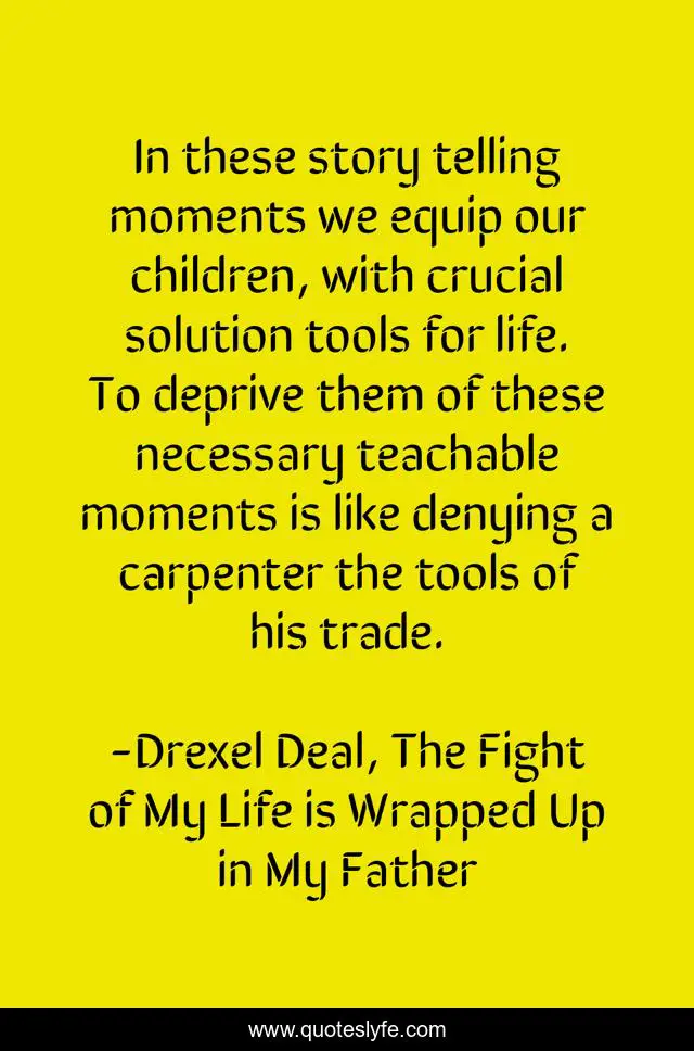 This page presents the quote "In these story telling moments we equip our children, with crucial solution tools for life. To deprive them of these necessary teachable moments is like denying a carpenter the tools of his trade.". Author of this quote is Drexel Deal, The Fight of My Life is Wrapped Up in My Father. This quote is about conflict-resolutions, training, powerful-stories, child-rearing, storytelling, good-parenting, parenting, social-skills, equipping-children,.