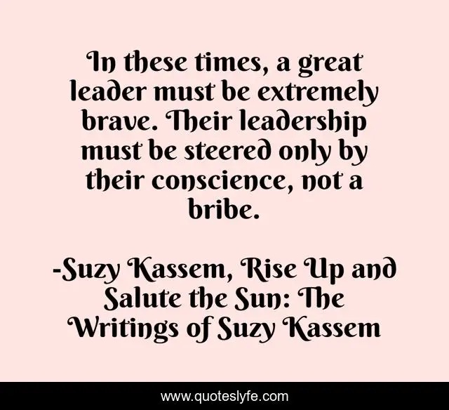This page presents the quote "In these times, a great leader must be extremely brave. Their leadership must be steered only by their conscience, not a bribe.". Author of this quote is Suzy Kassem, Rise Up and Salute the Sun: The Writings of Suzy Kassem. This quote is about conscience, brave, politician, bribe, character, focus, corruption, politics, leadership,.