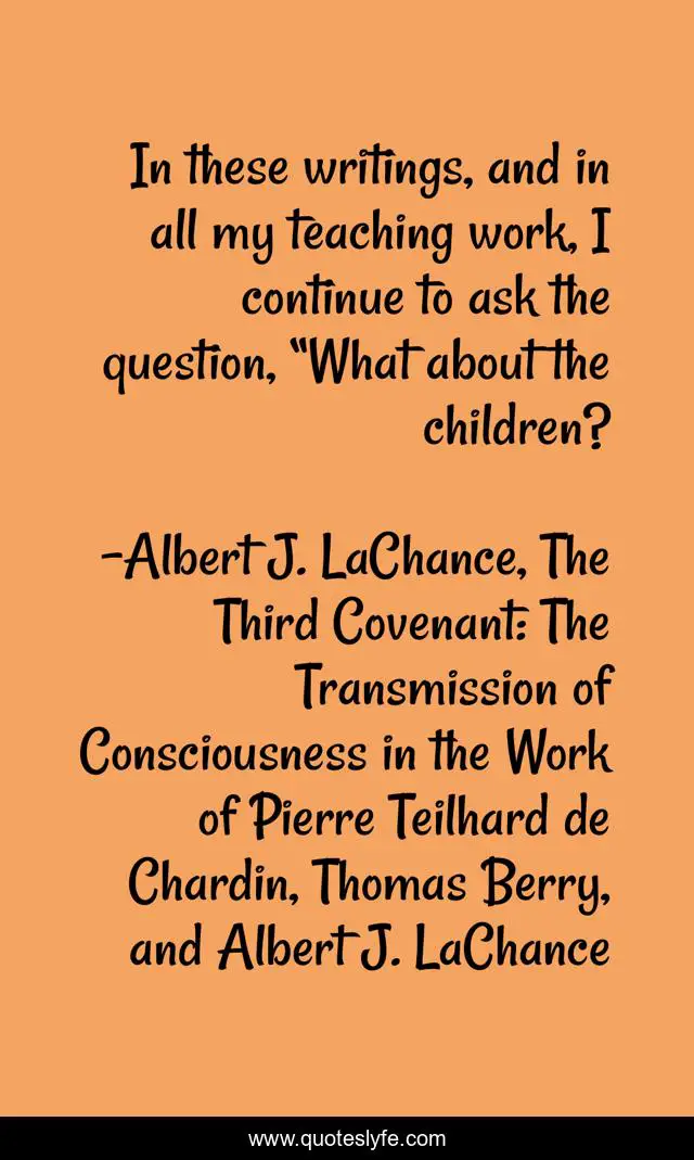 This page presents the quote "In these writings, and in all my teaching work, I continue to ask the question, “What about the children?". Author of this quote is Albert J. LaChance, The Third Covenant: The Transmission of Consciousness in the Work of Pierre Teilhard de Chardin, Thomas Berry, and Albert J. LaChance. This quote is about spirituality, future, children,.