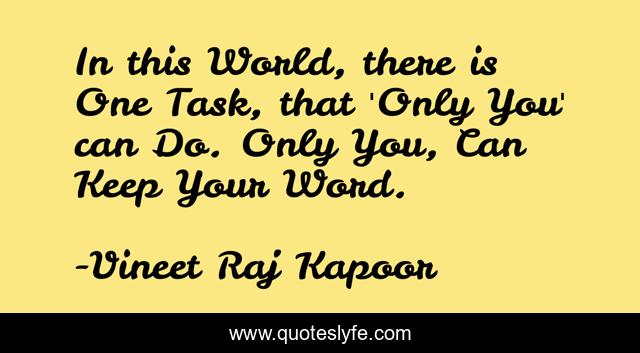 This page presents the quote "In this World, there is One Task, that 'Only You' can Do. Only You, Can Keep Your Word.". Author of this quote is Vineet Raj Kapoor. This quote is about task, word, destiny, honour, good-work, vow, ego, never-quit, promise,.