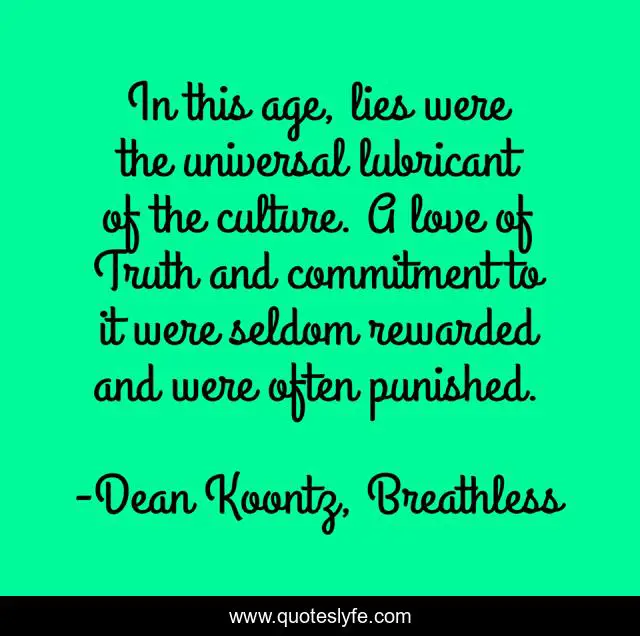 This page presents the quote "In this age, lies were the universal lubricant of the culture. A love of Truth and commitment to it were seldom rewarded and were often punished.". Author of this quote is Dean Koontz, Breathless. This quote is about lies, rewarded, punished, commitment, truth,.